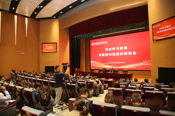 426日下午,学校在综合楼一楼报告厅举办党史学习教育宣讲会,党史学习教育市委宣讲团成员顾伟黎副教授作题为《百年风华  辉煌历程》的主题宣讲,全体校领导、中层以上干部,全体辅导员,马克思主义学院全体教师到场聆听。