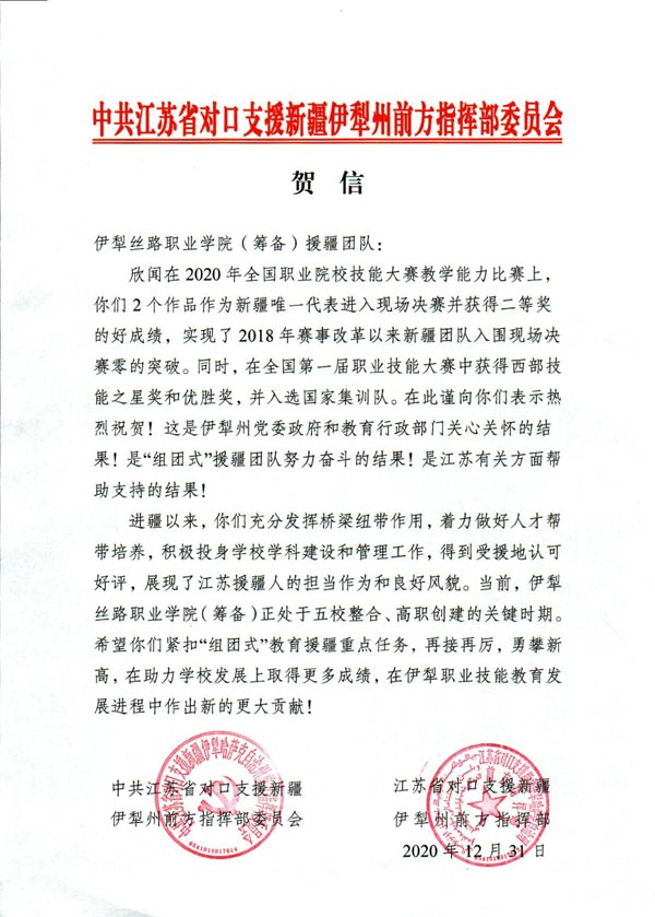 12月31日,江苏援伊前方指挥部向伊犁丝路职业学院(筹备)发去了贺信,指出援疆团队进疆以来,充分发挥桥梁纽带作用,着力做好人才帮带培养,积极投身学校学科建设和管理工作,得到受援地认可好评,展现了江苏援疆人的担当作为和良好风貌。伊犁州党委副书记、组织部部长石岗在对伊犁丝路职业学院(筹备)相关工作的批示中说:“这么短的时间取得了这样的好成绩,充分体现了‘组团式’援疆的优势,充分体现了援疆干部的辛勤努力!”