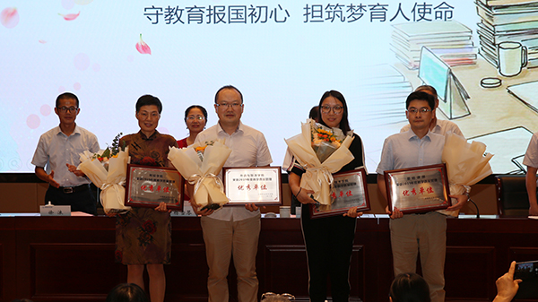 校领导分别为获表彰的人员颁发荣誉证书、为受奖单位授牌,学生代表为获奖、入选青蓝工程的老师献上鲜花。