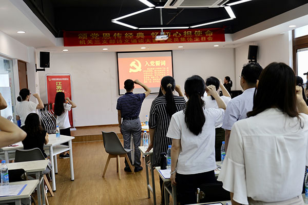 世间事,一日易,一生难。为了让同志们牢记入党时对党做出的承诺,在通过视频回顾了我们党的百年征程之后,支部宣传委员陈明媛带领全体党员面对党旗,举起右手,重温入党誓词。