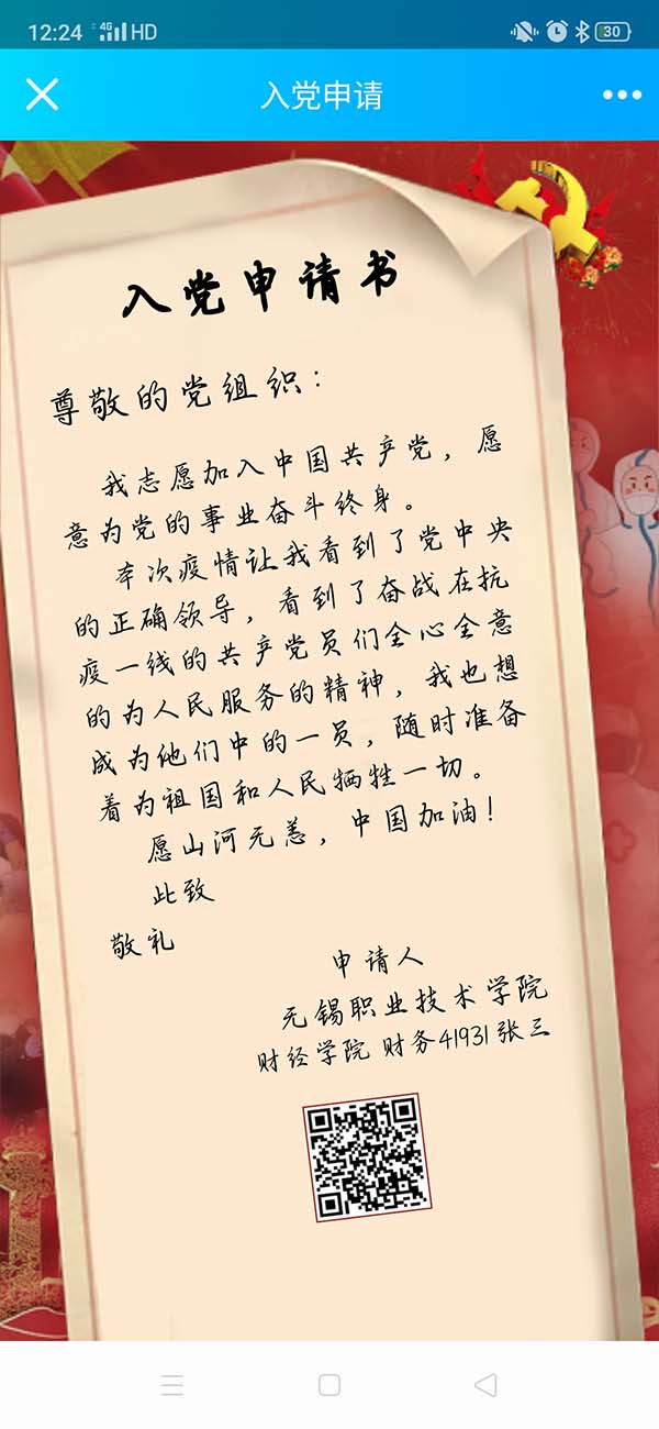 近日,一份特殊的入党申请书在财经学院学生们的QQ群、微信群中火热传递。只要长按识别图片中的二维码,填入所在学院、班级、姓名,就能自动生成一份专属自己的入党申请。不到两天时间,财经学院学生党支部就收到了100余份网络入党申请书。