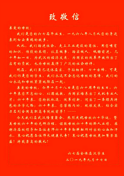 9月17日,必赢武汉地区1967届老校友欢聚一堂共唱校歌,庆祝母校60周年华诞。活动由老校友丁兆金主持。