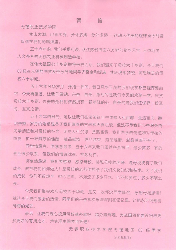 63级校友给母校的贺信