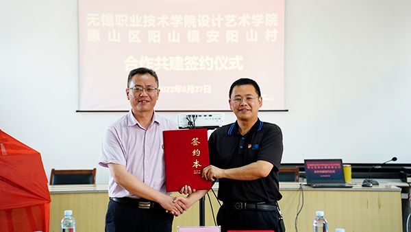 设计艺术学院党总支与安阳山村党总支举行了党建共建签约仪式。仪式上,苗勇、杨国光分别就单位概况、组织共建、活动联办等情况进行了深入的交流和探讨,双方表示可以在乡村环境美化、水蜜桃包装设计、直播带货、剪纸、扎染等非遗传承体验、农村留守儿童心理支持等方面助力乡村振兴,发挥学校在社会服务方面的优势。双方签订了党建共建协议书,并为无锡职业技术学院设计艺术学院“三下乡”暑期社会实践基地、劳动教育实践基地揭牌。