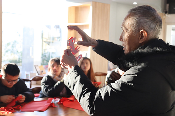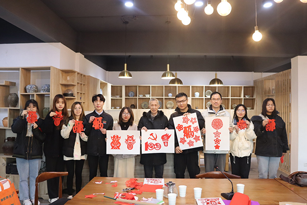 11月23日,设计艺术学院党员师生一同前往拜访红色创作剪纸艺人郭宗新老先生,并邀请老先生到校授课,感受剪纸这项非遗文化的魅力,传承和发扬中华优秀传统文化。