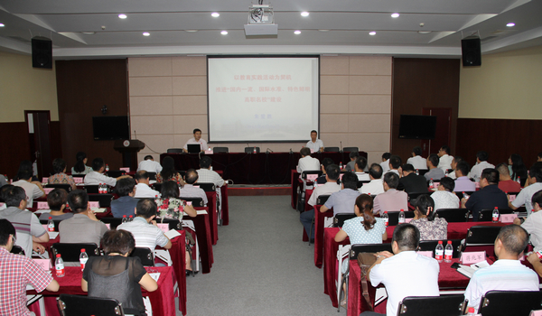 当天上午,党委书记朱爱胜在动员讲话中要求大家统一思想、提高认识,理论联系实际、共谋学校发展,遵守学习纪律、保证学习效果。校长龚方红从党的建设、教育教学、师资队伍建设、科学研究水平、招生就业、校园建设与后勤保障六个方面回顾了学校上半年工作,并结合全国、全省及本市同类院校发展情况深入分析了学校现状,指出当前和今后一个时期是学校不断提升办学水平、深化内涵建设、全面升级进位的重要时期,提出建设“国内一流、国际水准、特色鲜明”的高职名校,必须在一流的师资队伍、一流的人才培养质量、一流的科学研究水平、一流的国际化水平、一流的领导力、一流的管理水平等方面狠下功夫,同时部署了扎实推进党的群众路线教育实践活动、建设一流的师资队伍、开展高水平的科学研究、建立一流的人才培养体系、探索国际化的突破口、更好服务学生成长成才等下半年的重点工作和努力方向。对外经济贸易大学史薇教授在题为《高等教育分类管理阶段性变化与经济社会发展阶段对应研究及国际化比较》的报告中,运用大量数据阐述了欧美国家高等教育分类改革的三个阶段、欧美国家高等教育分类改革的社会经济背景、中国与欧美国家高等教育分类改革的社会经济背景对比、典型国家高等教育结构与国家竞争力关系分析、对我国高等教育分类改革的初步设想、我国职业教育改革的路径选择与实施策略。