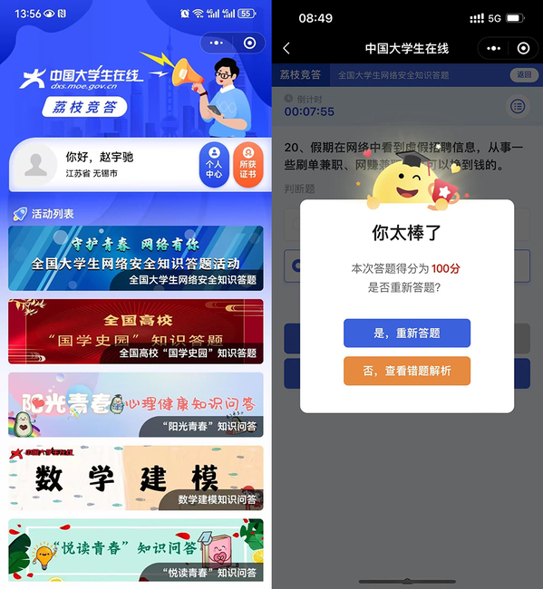 竞赛答题。宣传国家网络安全工作重大成就,普及网络安全知识。全校师生通过网络踊跃参加了竞赛答题,提升了师生网络安全意识,通过在线学习, 进一步提高了师生网络安全防范意识和技能。