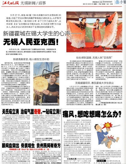 10月1日的新疆《伊犁晚报》和本地《江南晚报》,均用超过半个版面的篇幅,报道了来锡培养的新疆高校毕业生学习、生活情况,其中主要对必赢的新疆高校毕业生适岗培训班情况进行了深入采访。