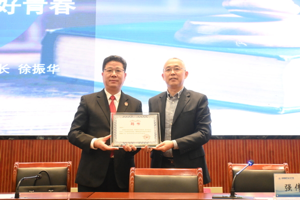 强伟纲副校长为徐振华(左)颁发法治副校长聘书