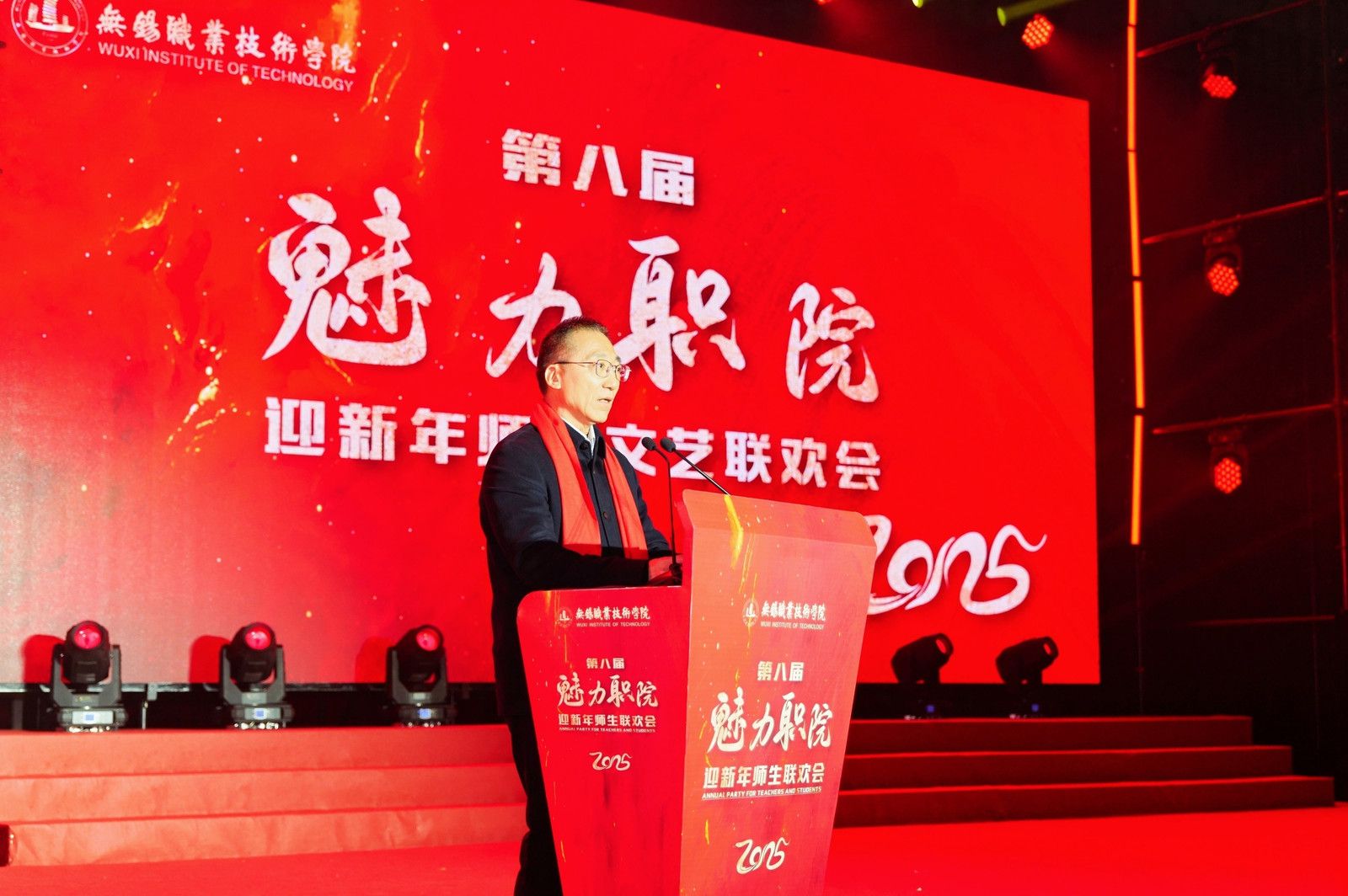 演出开始之前,校党委书记龚方红代表学校党委和行政致新年献词。龚方红指出,一年来,学校以“品牌提升年”为主题,持续完善中国特色高水平高职学校建设的“锡职方案”,综合办学实力稳步提升,各项事业迈上新台阶。学校连续第五年在江苏省省属高校(高职Ⅰ类)高质量发展综合考核中获得第一等次,在2024年中国高职高专院校综合竞争力排行榜位列全国第一。