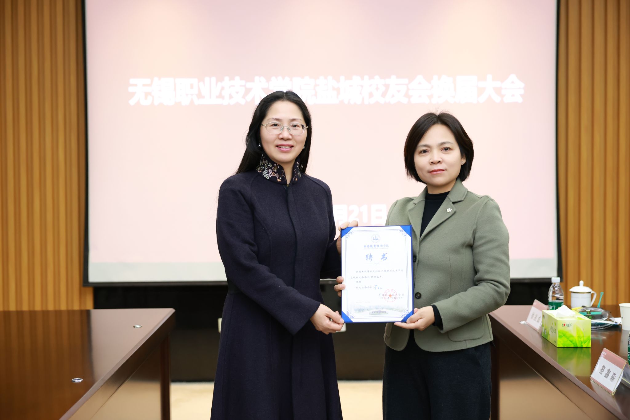 校友办副主任石华宣读了关于同意无锡职业技术学院盐城校友会理事会换届的批复文件,盐城校友会第二届理事会由王丽萍、孙海甲、朱学明、孙元勋、邱君仁、吴迅、周步江、严广、钱建峰、杨颖晨、庄重、王祖荣、张爱民、苗长兵、祭鑫森、徐兆成、张勇等校友组成,孙海甲、朱学明两位校友任名誉会长。杨雪琴为新一届理事成员颁发了聘书。