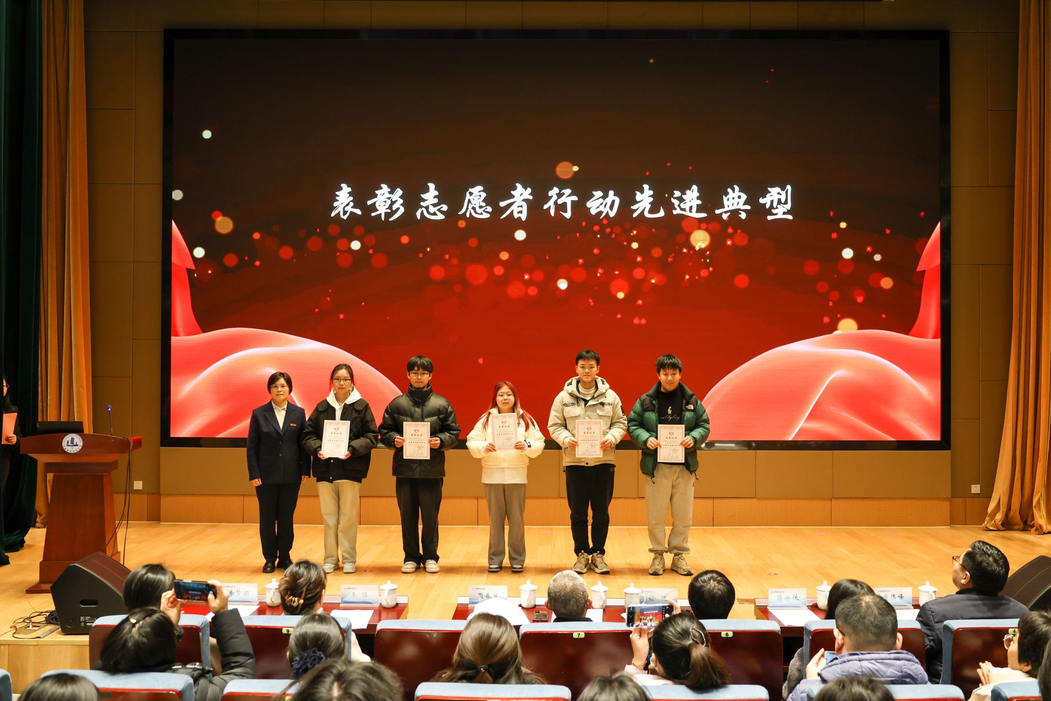 活动现场表彰了2024年度学校优秀志愿者、优秀志愿服务项目和优秀志愿组织;惠山区洛社镇正明村党务员黄伟峰和校史文化宣讲团翟羽佳分别作为共建单位代表和优秀志愿服务典型代表作交流发言;学校团委与无锡太湖新城集团,江南大学附属医院,大世界影城,滨湖区马山街道乐山社区,经开区华庄街道万欣社区,惠山区洛社镇正明村等6家单位和社区进行志愿服务共建签约。
