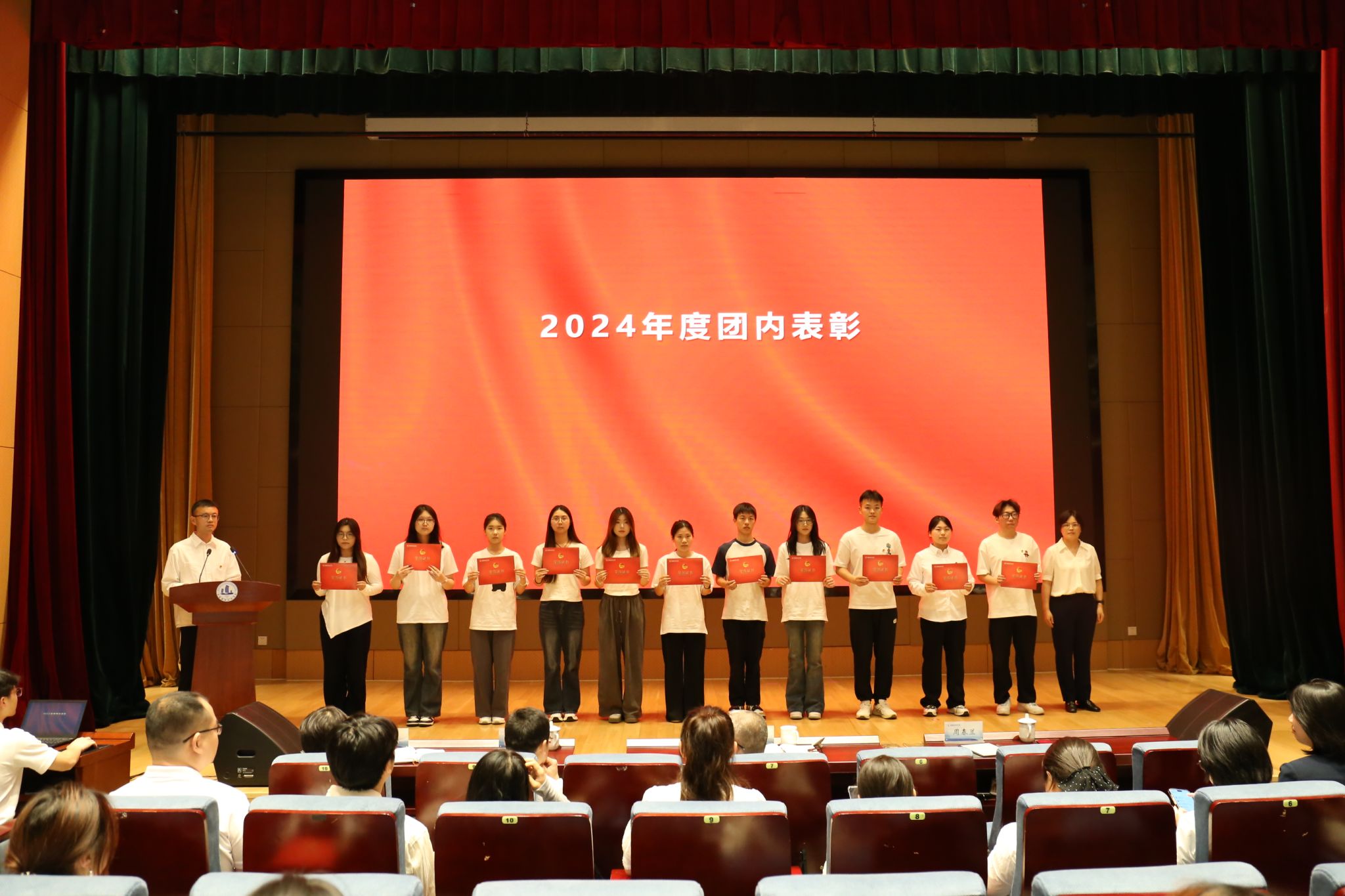 活动由校团委副书记庞军主持。活动在庄严的国歌声中拉开帷幕。校团委书记郑月圆宣读2024年度团内表彰决定,到场领导嘉宾依次为获奖代表颁发荣誉证书。机械工程学院薛尚同学和开源创新创业学院殷柯望老师分别作为获奖师生代表发言。