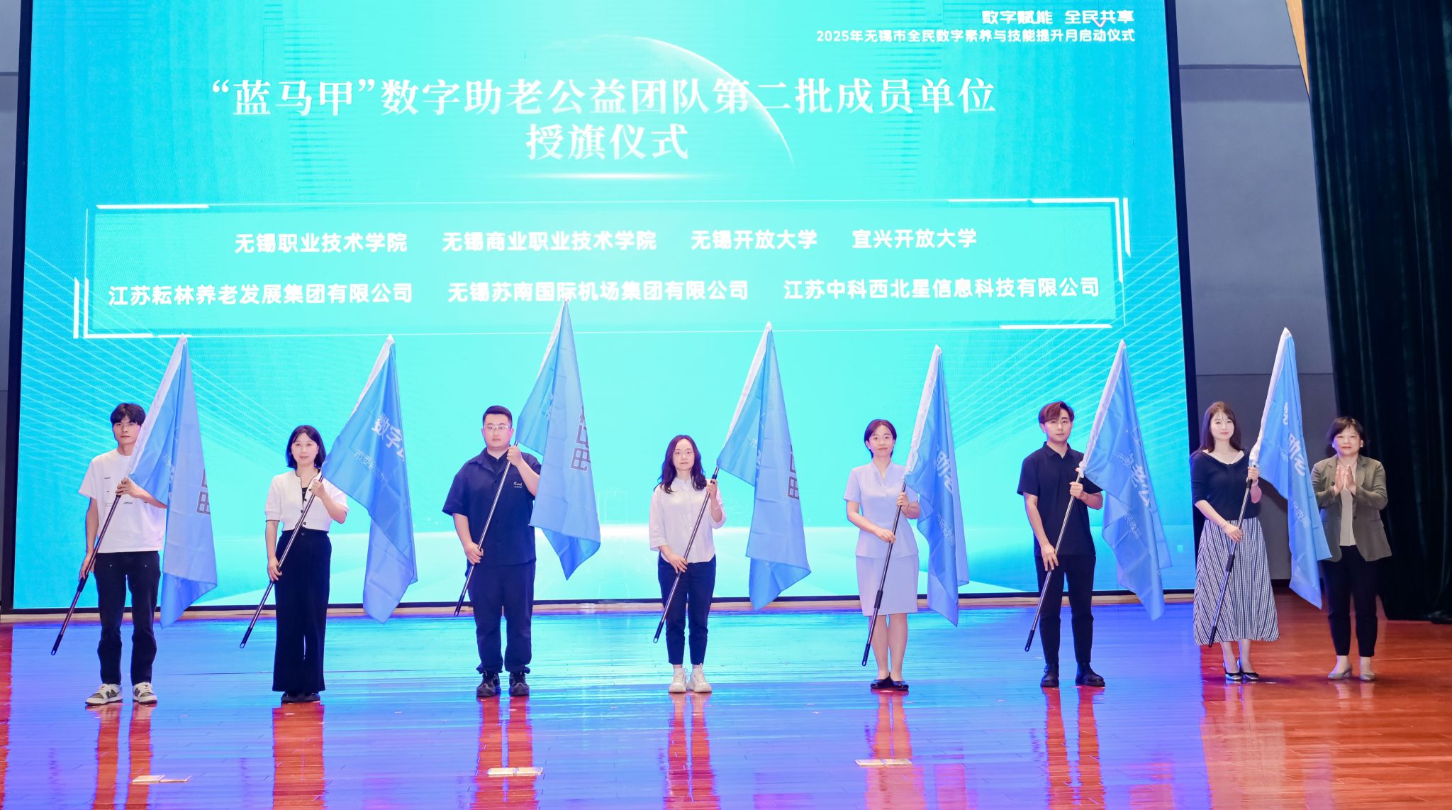 5月26日,由无锡市委网信办等12家单位联合主办的2025年无锡市全民数字素养与技能提升月启动仪式在无锡学院举行,财经学院《老友计划——智慧助老手机课堂》志愿服务项目获得无锡市“蓝马甲”数字助老公益团队第二批成员单位授旗。