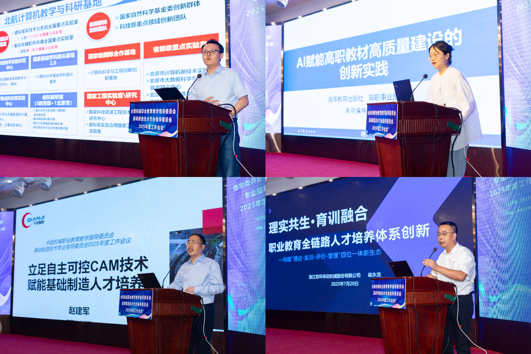 会议还邀请了北京航空航天大学特聘副研究员邰振赢、高等教育出版社主任、高级编辑张璋,及苏州千机智能技术有限公司董事长赵建军、浙江双环传动股份有限公司智能制造总监崔永龙作为企业家代表分别以《人工智能技术在智能制造领域应用探索》《数智时代AI赋能高职教材高质量建设的创新实践》《立足自主可控CAM技术,赋能基础制造人才培养》《理实共生育训融合——职业教育全链路人才培养体系创新》为题做了专题报告。