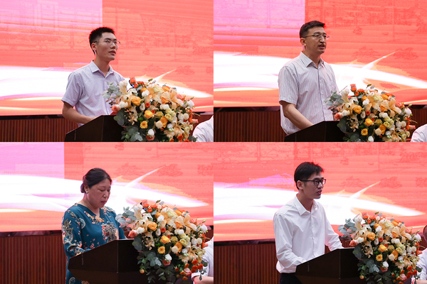 双创学院金达信创新班的祁昕同学带领所有毕业生以青春的名义向未来宣誓:不负期望、不负使命,脚踏实地,强国有我!随后,汽车与交通学院郭祥龙同学作为毕业生代表表达了对学校、老师、父母、同学的感谢,也发表了激昂的誓言:志愿在专业领域内成就光辉灿烂的职业梦想。物联网技术学院杨文珺老师作为教师代表在回忆与学生相处的点点滴滴之后,对毕业生提出四点期望:要保持健康的体魄、有思想的阳光、爱和宽容、有坚定的信念、有责任和担当。管理学院工商42032王煜同学的家长邓娟女士代表毕业生家长回顾了三年来孩子的变化,对学校、老师表达了感谢,同时也叮嘱毕业生们要发扬和传承母校精神,努力成为对国家、对社会有用的栋梁之才。作为优秀校友代表,机器人21631班陈虎结合自己的经历,真挚地与毕业生分享了“怀揣理想、敢于实践、勿骄勿躁” 的感悟。