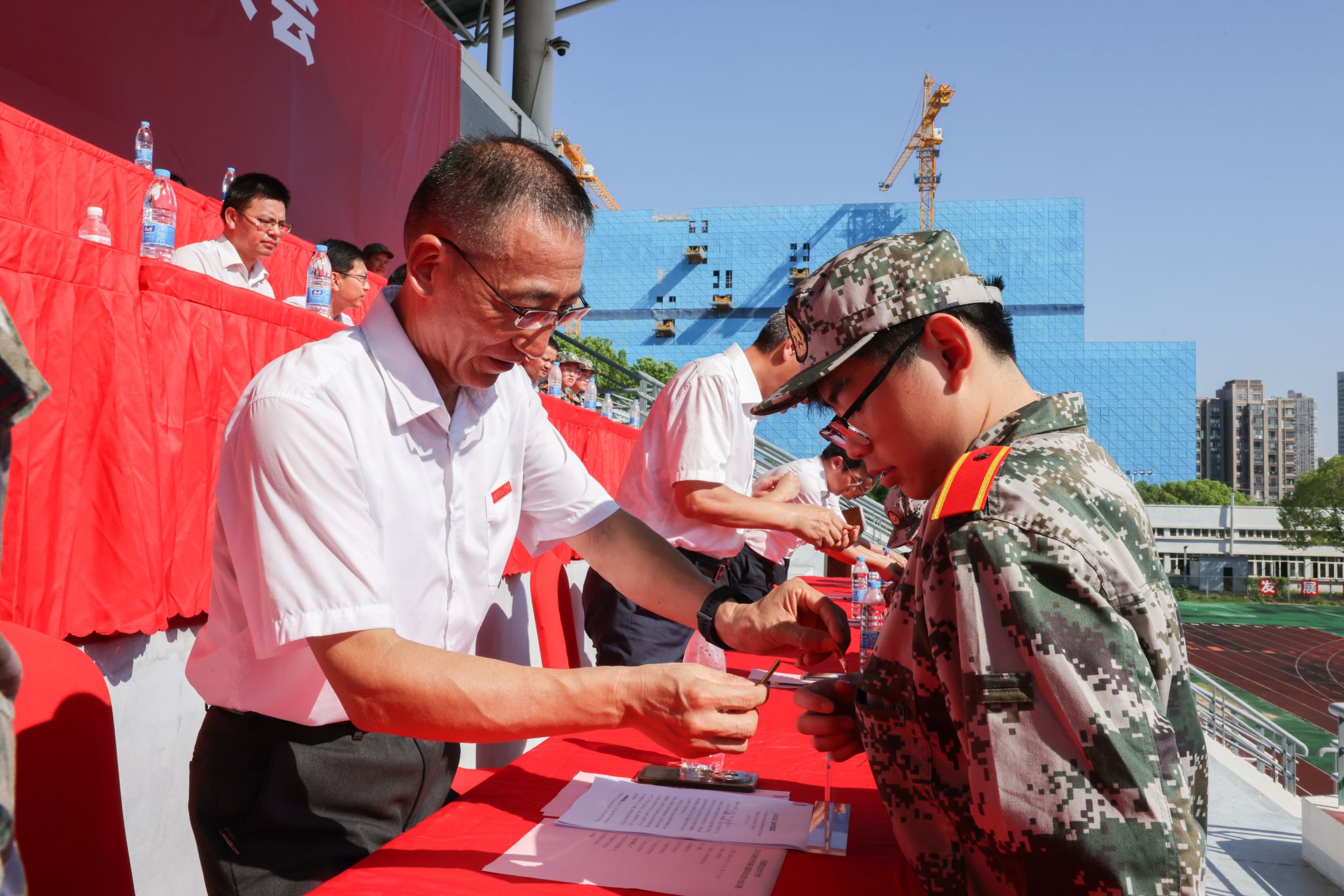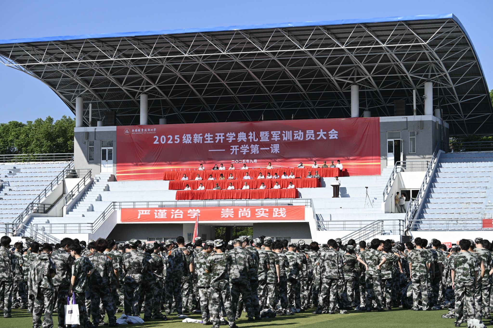 秋风送爽,丹桂飘香。9月15日上午,学校2025级新生开学典礼暨军训动员大会在体育场举行。校党委书记龚方红、校长周桂瑾、武警驻锡某部上校王涛、副校长储开峰、纪委书记李衔、副校长奚茂龙,有关职能部门、各二级学院相关负责人,及全体教官、2025级辅导员、班主任、新生参加大会。大会由储开峰主持。