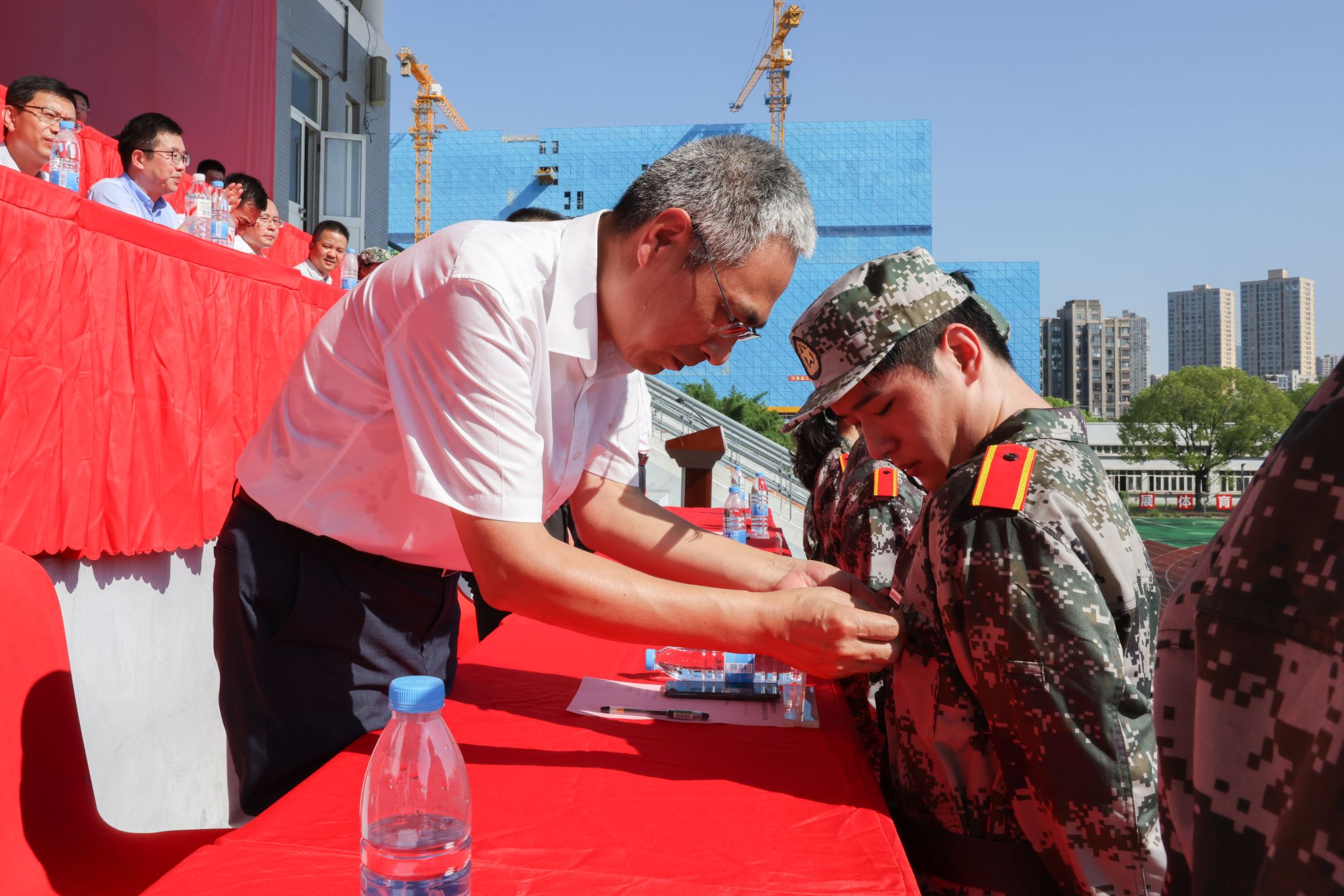 周桂瑾为学生军训旅授旗,飘扬的旗帜标志着2025级新生军训正式启动。