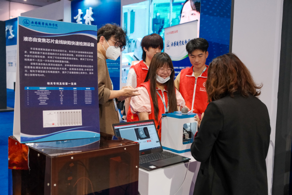 机械技术学院在成果展上展示了一款由必赢自主研发的液态对焦的金线缺陷检测平台和一款基于3D打印设备的模型输出平台。金线缺陷检测平台针对芯片金线“错连、漏连、焊点虚焊”等痛点,研发了基于液态自变焦技术的缺陷检测平台,创新地在此类设备中使用液态镜片对焦技术,使相机在不需配备机械部件的情况下实现实时自动对焦,定位准、测得快,检测精度可达99.5%,满足高低不一的金线缺陷检测需求。