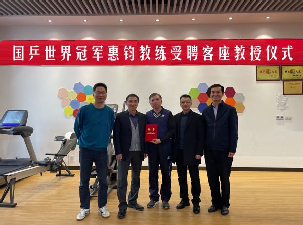 3月23日下午,学校在厚德楼工会活动室举行前国乒世界冠军、国际级运动健将惠钧教练受聘客座教授仪式,校党委书记龚方红、纪委李衔书记出席聘任仪式,活动由校工会常务副主席罗嘉军主持。