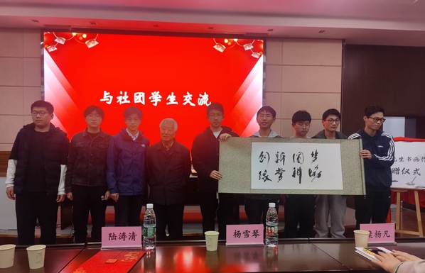 活动中,陆老先生现场挥毫,为同学们书写“润物无声”,勉励大家认真学习,踏实做事,并为同学带来专题讲座《学好书法的深远意义》,分享自己学习书法的经历和体悟。蠡溪书法协会李圣杰同学作为代表感谢了陆老先生多年来的悉心指导,并承诺将牢记嘱托,永葆初心,勤恳练习。