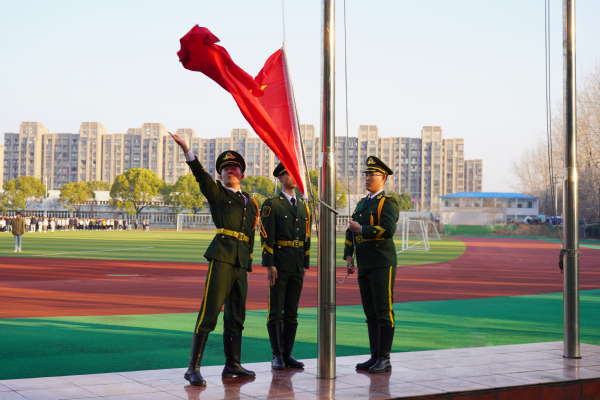 伴随着嘹亮的口号声,国旗护卫队的同学们迈着整齐的步伐前进。庄严的国歌奏响,五星红旗冉冉升起,全体师生行注目礼。