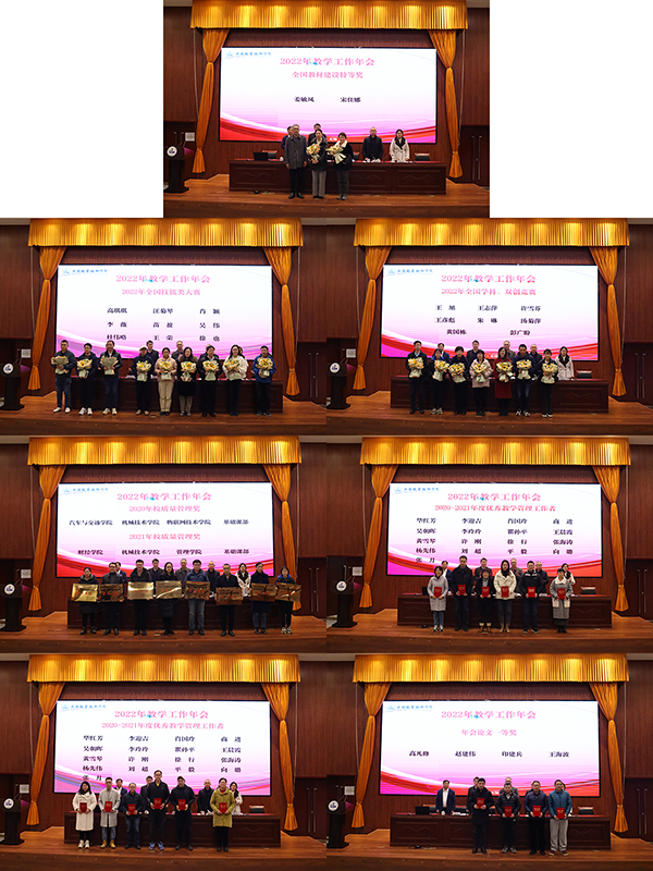 会上,对两年来学校取得省级及以上高水平教研项目,对校级教学类获奖部门及人员进行了表彰。先后宣读了全国教材建设特等奖、入选国家示范性虚拟仿真实训基地项目;2022年全国职业院校技能大赛、2022年金砖国家职业技能大赛、2021和2022年全国大学生物理实验竞赛、2022年全国大学生数学建模竞赛等国赛一等奖获奖名单;2021年“互联网+”中国国际大学生创新创业大赛、第十七届“振兴杯”全国青年职业技能大赛(学生组)创新创效专项赛等国家银奖获奖名单;江苏省高水平专业群、江苏省“十四五”首批职业教育规划教材、“十四五”江苏省首批职业教育在线精品课程、江苏省重点教材获奖名单;并对2020、2021年度教学质量管理奖获评部门、2020-2021年度优秀教学管理工作者、2022年教学工作年会论文一等奖等获奖者进行了颁奖。