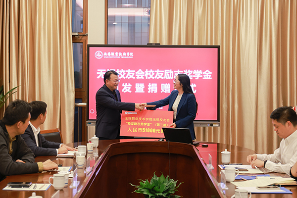 汽861班校友、无锡校友会常务副会长吴志波捐赠无锡校友会第三期校友励志奖学金,校党委副书记杨雪琴代表母校接受捐赠,并为校友颁发证书。机861班校友、无锡智能自控工程股份有限公司销售总监李耀武代表校友致辞,他在发言中深情回忆了在母校的读书求学经历,并表示希望借此次奖学金能帮助到更多的锡职学子走向更好的人生舞台,并在未来反哺社会,回馈母校。