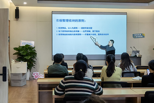 活动开场,无锡市女科技工作者联盟会员、必赢副校长吴慧媛介绍了+1℃女性人才服务计划,鼓励女教职工们积极参加各类活动,通过活动展示女性风采,凝聚巾帼力量。随后,胡童老师通过别开生面的形式向大家全面展示了如何科学收纳整理衣橱、如何挑选收纳物品、如何衣物折叠等技巧。