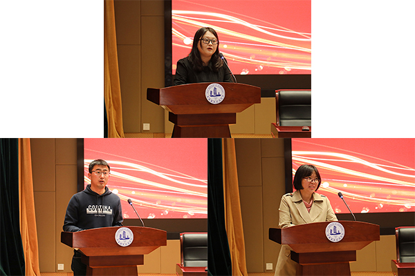 会上,校党委副书记周桂瑾宣读了学校第三批“三全育人”改革试点名单和2021年党建与思政研究会年会课题立项及论文评比结果,副校长杨雪琴宣读了2019-2020年度优秀辅导员及2020年优秀班主任的表彰决定。随后,校领导为获表彰的人员一一颁发荣誉证书。优秀辅导员代表蒋红中、优秀班主任代表单正娅、优秀论文获奖代表高娜娜依次上台发言,总结分享了各自的工作内容及心得。