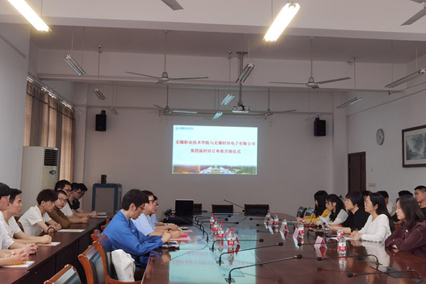5月11日下午,第四届村田订单班开班仪式在汽车与交通学院205会议室举行。无锡村田电子有限公司总经理錦織巧先生、管理部部长下枝圭介先生,管理部担当副部长符黛贤女士,管理部人事科担当科长周萍女士等一行5人,副校长杨雪琴及学生处、机械技术学院、控制技术学院等相关部门负责人和班主任老师出席开班仪式。