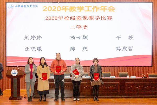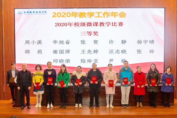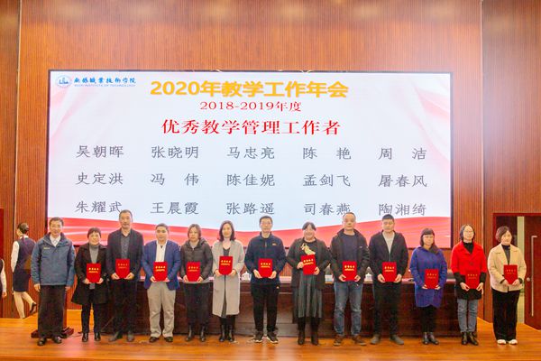 会上还宣读了2018年国家级教学成果奖、2019年无锡市教学成果奖、2个国家级高水平专业群、7个创新发展行动计划认定骨干专业、2018年国家精品在线开放课程、2018-2019年江苏省高校在线开放课程立项建设课程、2018年至2020年全国职业院校技能大赛、2018年“挑战杯—彩虹人生”全国职业学校创新创效创业大赛、2019年“挑战杯”江苏省选拔赛、江苏省第四第五第六届“互联网+”大学生创新创业大赛、2018江苏省高等职业院校信息化教学大赛、2019年江苏省职业院校教学大赛、2019年江苏省高校微课教学比赛、首批课程思政示范课建设立项项目、首批“新型活页式”教材建设研究立项项目等比赛或项目名单,表彰了2020年校级微课教学比赛、2020年校级教学能力比赛、2018-2019年度优秀教学管理工作者、2020年第十二届教学工作年会论文比赛等获奖者。