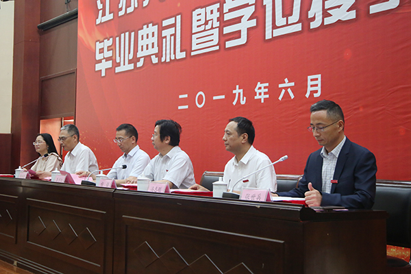 龚方红校长在毕业贺词中回顾了2019届高职本科生在校期间取得的重要成绩,代表母校送上了他的嘱托,寄语同学们要不忘初心,坚持自我;热爱生活,悦纳自我;秉承匠心,实现自我。机制11541班陈占富同学作为毕业生代表发言,管理学院于云波教授作为教师代表发言。江苏大学梅强副校长在毕业致辞中介绍了江苏大学近年发展成就和联办高职本科项目建设成果,对毕业生提出了新的希望,希望同学们有“敢叫日月换新天”的青春豪气,有“踏平坎坷成大道”的青春锐气,有“各领风骚数百年”的青春才气。