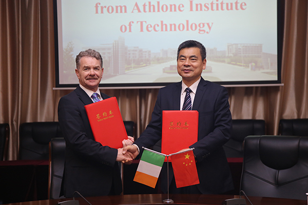 爱尔兰学院平毅老师向代表团详细介绍了专业对接情况和招生情况。座谈会后,朱爱胜书记代表学校与卡荣校长签署了爱尔兰学院办学执行协议。
