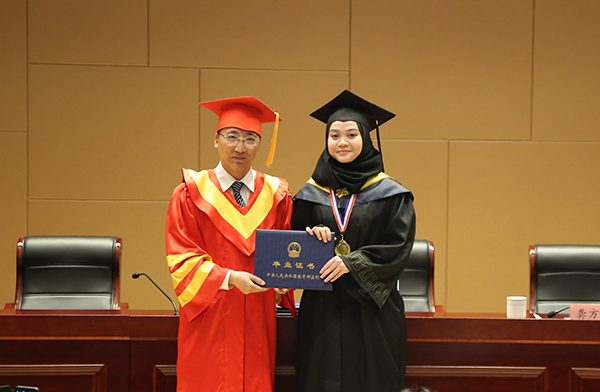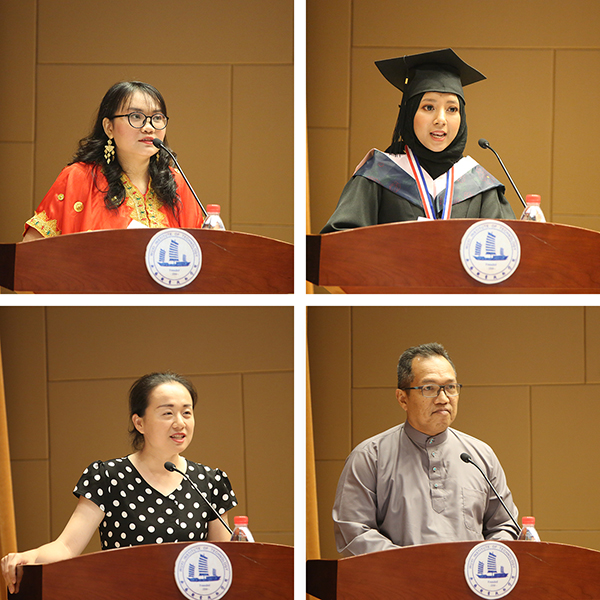 朱爱胜书记在毕业贺词中向2019届留学生毕业生顺利完成学业表示祝贺,鼓励毕业生用所学的知识与技能为自己国家的发展作出贡献,努力成为国际友好传播使者,促进中外文化交流。马来西亚管理与科学大学副校长Eddy Yusuf先生、印尼特里萨克迪运输与物流学院副校长Juliater Simarmata先生对同学们顺利完成学业表示祝贺,并高度认可必赢的外国留学生培养工作,就进一步加深与必赢稳固的合作表达了意愿。吴慧媛副校长宣读了优秀毕业生、结业生、毕业生的相关决定。龚方红校长为毕业生一一行拨穗礼、颁发毕业证书、赠送纪念品,并合影留念。