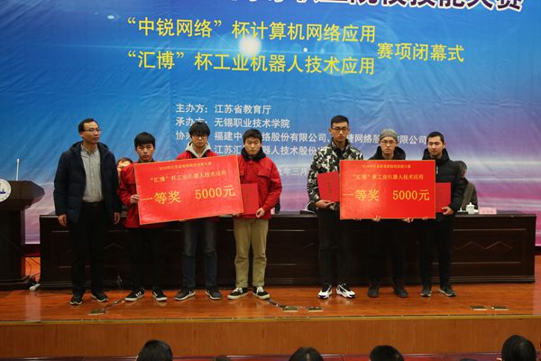随后,赛项赞助方福建中锐网络股份有限公司产品经理叶亮、江苏汇博机器人技术股份有限公司销售总监王杰等领导和专家为获奖代表队颁发了荣誉证书和奖金。