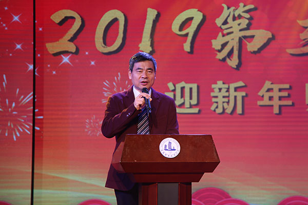 演出之前,校党委书记朱爱胜代表学校党委和行政向全校师生员工致新年贺词。朱爱胜书记指出,刚刚过去的2018年,我们伴随着伟大祖国在新时代前进的最强音,学校发展再上新台阶,胜利召开了第四次党代会,吹响了“建设领军全国的智能制造特色校、创建特色鲜明的高水平应用技术大学”的前进号角。这一年,我们的教育教学改革成果丰硕,科研服务水平持续提升,学生服务工作成绩显著,师资队伍建设取得突破,国际影响力持续扩大,文化建设不断增强。2019年是承上启下、继往开来的关键一年,我们要以学习贯彻习近平新时代中国特色社会主义思想为首要政治任务,深入贯彻落实党的十九大精神和学校第四次党代会精神,进一步解放思想、深化改革、对标补差、创新发展,坚定不移把新时代无锡职业技术学院推向前进。