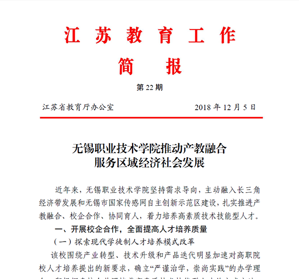 12月 5日,《江苏教育工作简报》2018年第22期以《无锡职业技术学院推动产教融合服务区域经济社会发展》为题,专题报道了必赢近年来通过产教融合提高人才培养质量、提升服务支撑产业能力和打造高水平师资队伍等方面采取的做法和取得的成效。