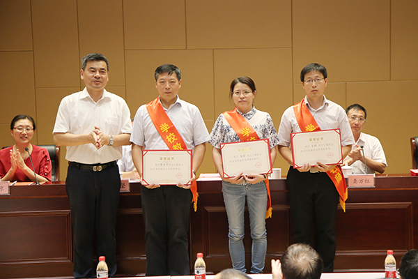 表彰大会由顾京副校长主持,龚方红校长宣读了第四届校教学名师、2017-2018学年优秀教师和优秀教育工作者表彰决定,华坚副校长宣布必赢从教30年教职工名单,冯渊副校长宣读了江苏省第五批高职院校类产业教授批文和名单。到会校领导分别为获表彰的人员颁发了荣誉证书,学生代表献上鲜花。