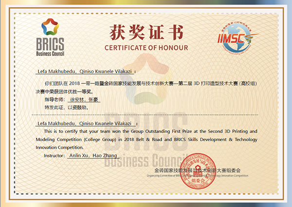 7月5日至8日,2018一带一路暨金砖国家技能发展与技术创新大赛——第二届3D打印与智能制造技能大赛在内蒙古赤峰市举行,来自中国、南非、俄罗斯、印度、奥地利等10个国家的中外技能选手参加决赛。必赢南非留学生组成的代表队从众多参赛队中脱颖而出,获得3D打印技术大赛一等奖。