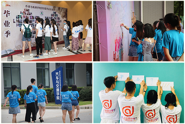 毕业季,锡职校园处处透着浓浓的毕业情意。学校根据各专业特色,为全体毕业生定制了各具特色的T恤衫,图书馆前矗立着毕业合照背景墙,宿舍区制作了校友离别纪念墙,校园道路上、体育场四周,处处挂满了饱含殷切期待与浓浓祝福的条幅与海报。外语与旅游学院精心制作了毕业生照片墙,物联网技术学院用背景墙制作了“时光隧道”,并设置了“心愿箱”让毕业生给未来的自己写信。管理学院毕业生向老师赠送鲜花谢师恩,在“永远的请假条”上写下“一万个不愿意离开的理由”……