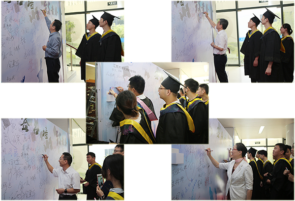 典礼开始前,全体本科毕业生与两校领导及老师合影留念;江苏大学梅强副校长,必赢朱爱胜书记、龚方红校长、顾京副校长等与毕业生一起在签名墙上签名留念。