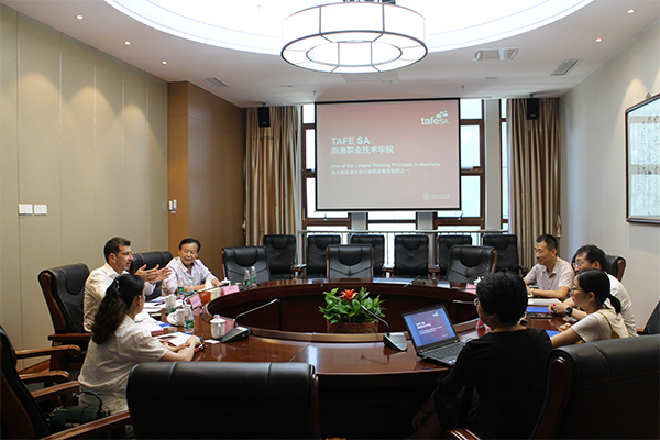 5月16日上午,南澳TAFE学院副校长布莱特·马奥尼先生、国际合作处主任贾飞霞女士、澳中友好发展协会名誉会长胡铁川先生,赛领集团中国区业务总监杨俐女士一行四人访问必赢,龚方红校长热情接待了来访团。