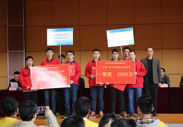 工业机器人技术应用赛项则要求选手完成机械和电气安装、视觉系统编程调试、工业机器人系统编程调试、工业机器人系统模块调试以及系统综合编程调试等任务,最终评出一等奖2名、二等奖4名、三等奖6名。该赛项较去年相比内容难度增加,平台更为开放、系统功能更加完整,也更接近工业实际的应用特点。必赢参赛队自去年选拔优秀学生参与集训,最终由陆荣、丁健老师指导的王军、聂阳和姜鑫同学代表学校出征,比赛当天现场发挥出色,夺得第一名,与江苏联合职业技术学院苏州工业园区分院共同获得一等奖。