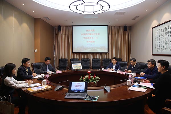 3月15日,台湾圣约翰科技大学艾和昌校长一行3人访问必赢,校领导朱爱胜、冯渊及国际交流合作处、党院办负责人接待了访问团一行。