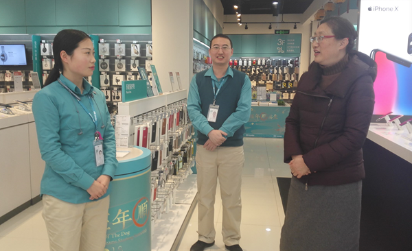 顾京副校长在无印良品海岸城门店与店长亲切交流了解学生实习情况