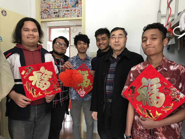 今年寒假留校的外国留学生来自马来西亚、印度尼西亚、老挝、泰国、喀麦隆等8个国家,共93名。冯渊副校长详细询问了寒假期间留学生们的学习生活情况,随后走访了宿舍,代表学校向留学生们致以最亲切、最真挚的节日问候。同时,送上了新年春联和福字贴花,希望他们在新的一年里再接再厉,取得更好的成绩。