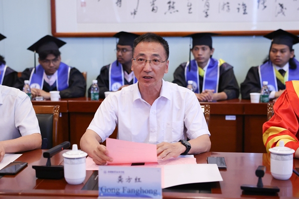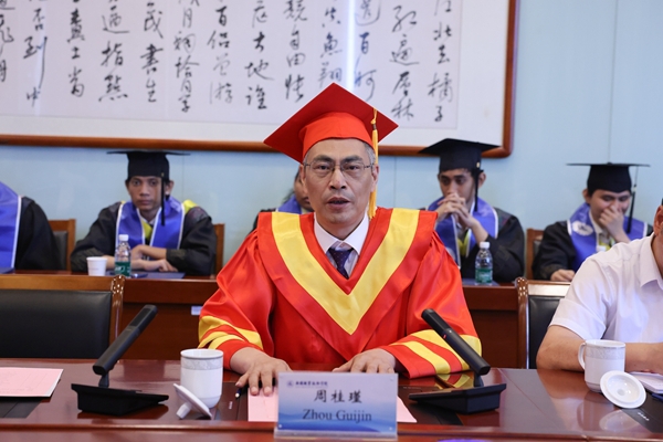 周桂瑾向顺利完成学业的毕业生们表示热烈的祝贺,并鼓励毕业生用所学的知识与技能为自己国家的发展作出贡献,努力成为国际友好传播使者,促进中外文化交流。