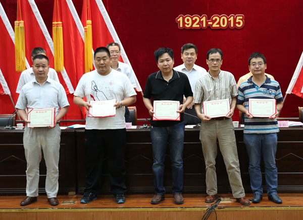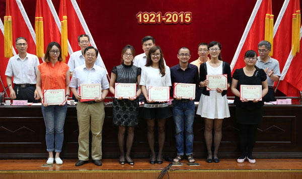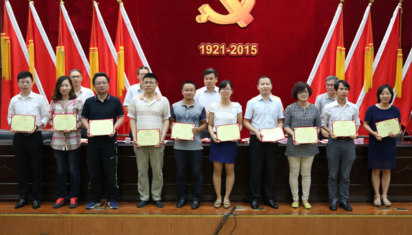 龚方红校长宣读了《省委教育工委关于公布江苏高校2013-2014年度党建工作创新奖和2014年度最佳党日活动优胜奖获奖评选结果的通知》和学校《关于表彰2014年度先进基层党组织、优秀共产党员、优秀党务工作者的决定》,必赢党委报送的《探索“三廉建设”新路径营造风清气正环境》获党建工作创新奖二等奖,必赢思政部直属党支部报送的《践行服务宗旨弘扬法治精神》获最佳党日活动优胜奖;机械技术学院党总支、物联网技术学院党总支、艺术与设计学院党总支、思政部直属党支部获“先进基层党组织”称号,李晓静、丁远、饶成明、胡珣、曹秀忠、孙鹏、姚晓宁、胡俊平、陈天娥、徐锋、王莹、徐进、孙台维、王莉群、徐优明、马融、沈小娟、王志萍、李凡、朱化坡、丁正荣、方京钰、陈刘棋、郭俊锋24位同志获“优秀共产党员”称号;周陆飞、周嫄、强伟纲、苗勇、于会权5位同志获评“优秀党务工作者”。华坚副校长宣读了学校《关于表彰2013-2014年度优秀辅导员和优秀班主任的决定》,瞿惠琴、王想实、黄雪琴、刘宗宝、许岚、王坤、陈利军、肖劲松8位老师获“优秀班主任”称号,朱琳、刘文庆、张静、任重威、路晓丽、丁正荣、高娜娜、马融8位老师获“优秀辅导员”称号。周桂瑾副校长宣读了学校《关于公布2015年党建暨思政研究会年会课题立项及论文评比结果的通知》和《党课教案评比结果的通知》,赵健、宋绍成、王莹老师撰写的《慕课时代的高校思想政治理论课教学范式改革路径研究》等文章获得一等奖,胡全裕、沈科进、盖虹、傅敏燕、高娜娜、郭再泉、朱琳老师撰写的论文获二等奖,王占东等10位同志撰写的论文获得三等奖;会上还有11个党建和思政相关课题立项,其中重点课题2项、一般课题9项。在今年的党课教案评比中,共评出一等奖1篇、二等奖2篇、三等奖10篇,其中徐悦老师的《自觉践行“三严三实”,凝聚分院发展正能量》获得一等奖,郭再泉老师《践行“三严三实”,推进作风建设,做忠诚干净担当的共产党人》和杨雪琴老师《践行三严三实,做忠诚干净担当的共产党员——学习习近平总书记关于全面从严治党的思考》获得二等奖。