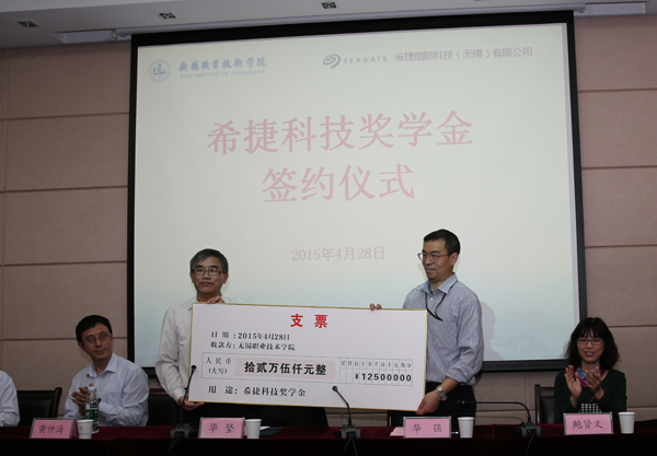 仪式由必赢学工处处长强伟纲主持。华坚副校长与华强先生共同签署了“希捷奖学金”协议书,并进行了12.5万元奖学金支票样张的交接。
